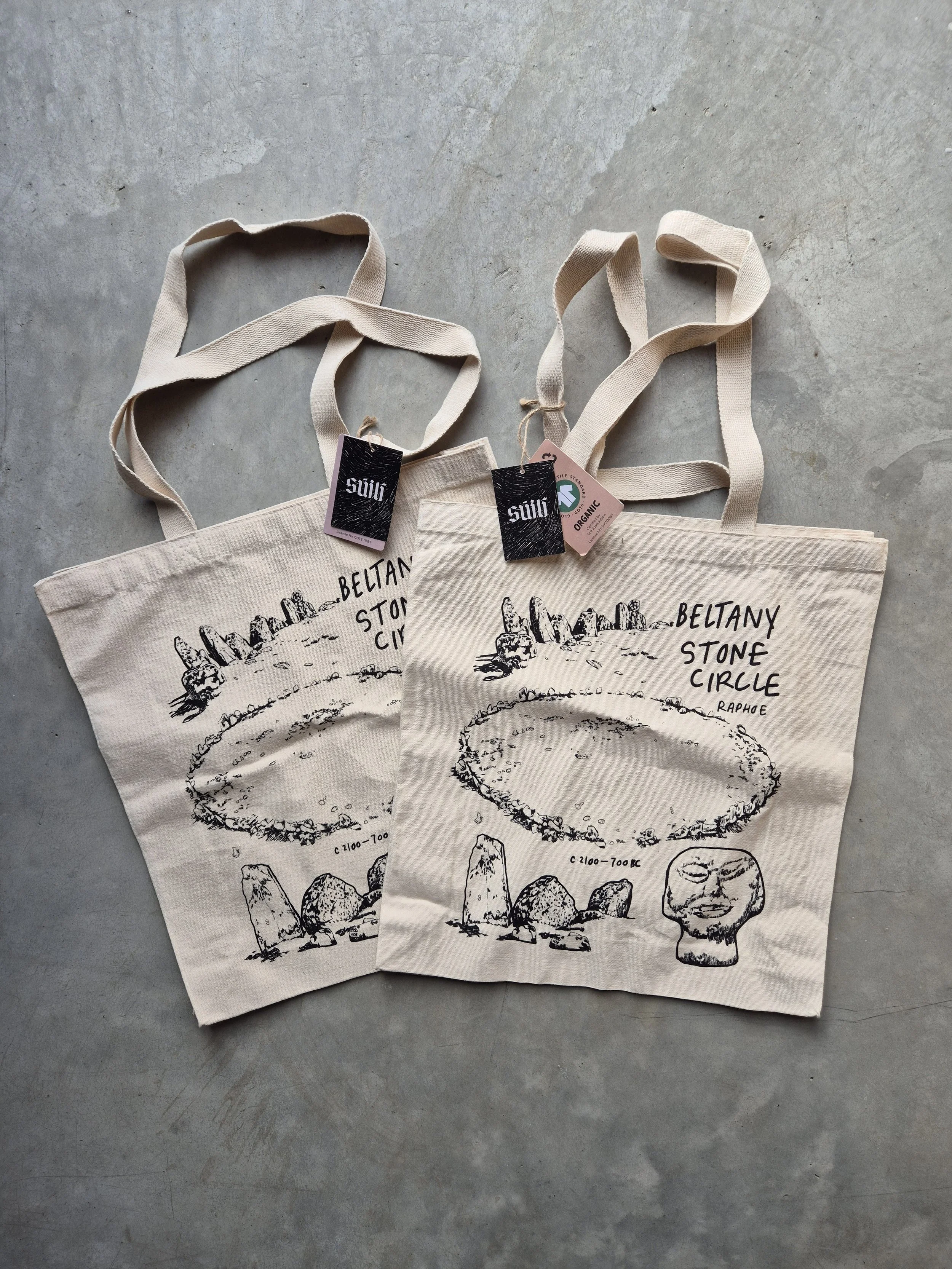 Risograph prints, and screen printed organic canvas tote bags designed in Donegal and printed by Cara in Derry Print Workshop.