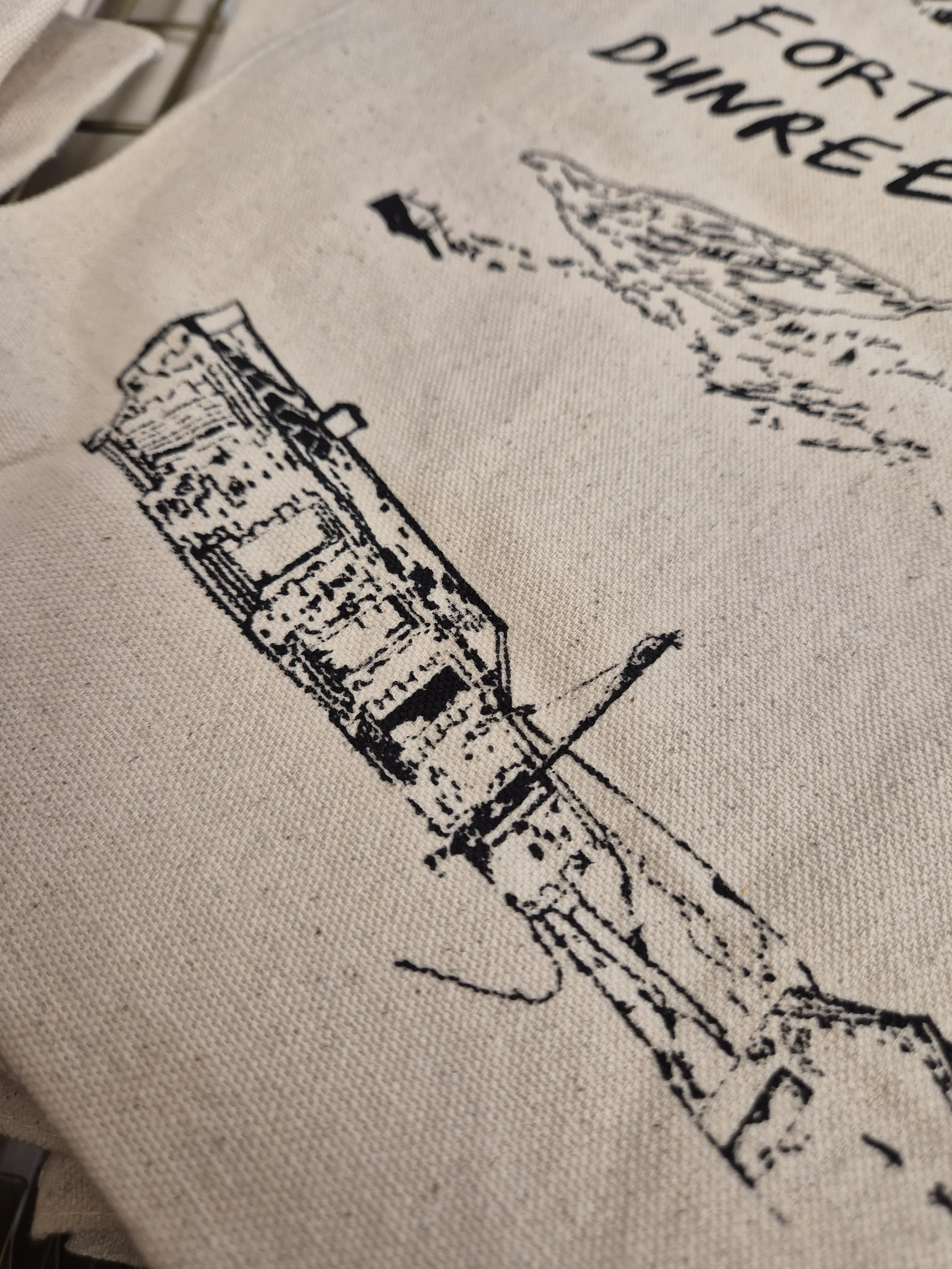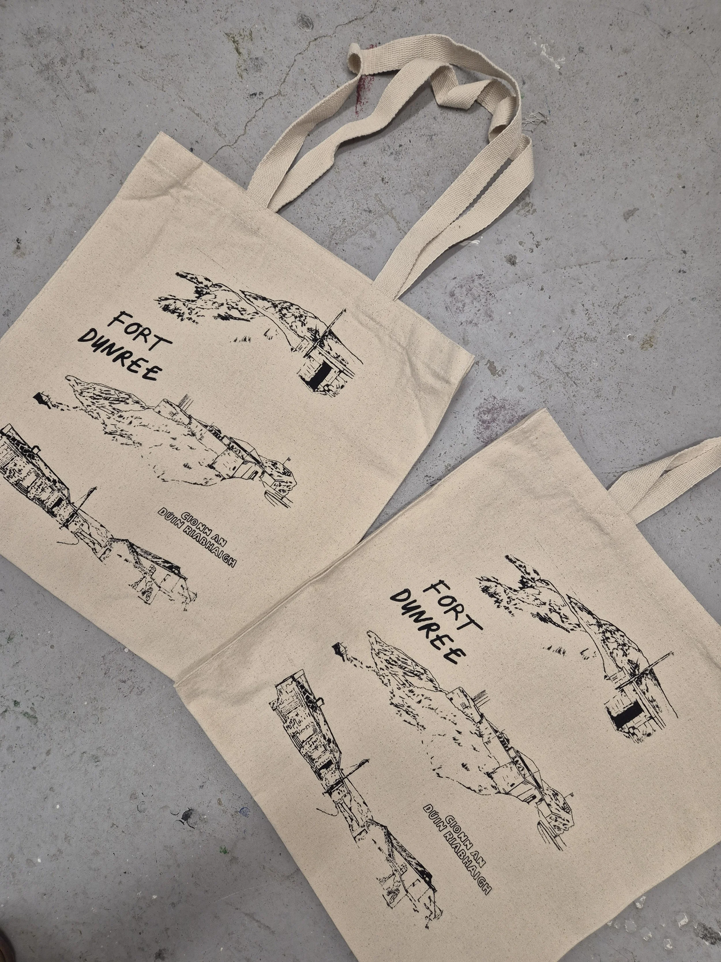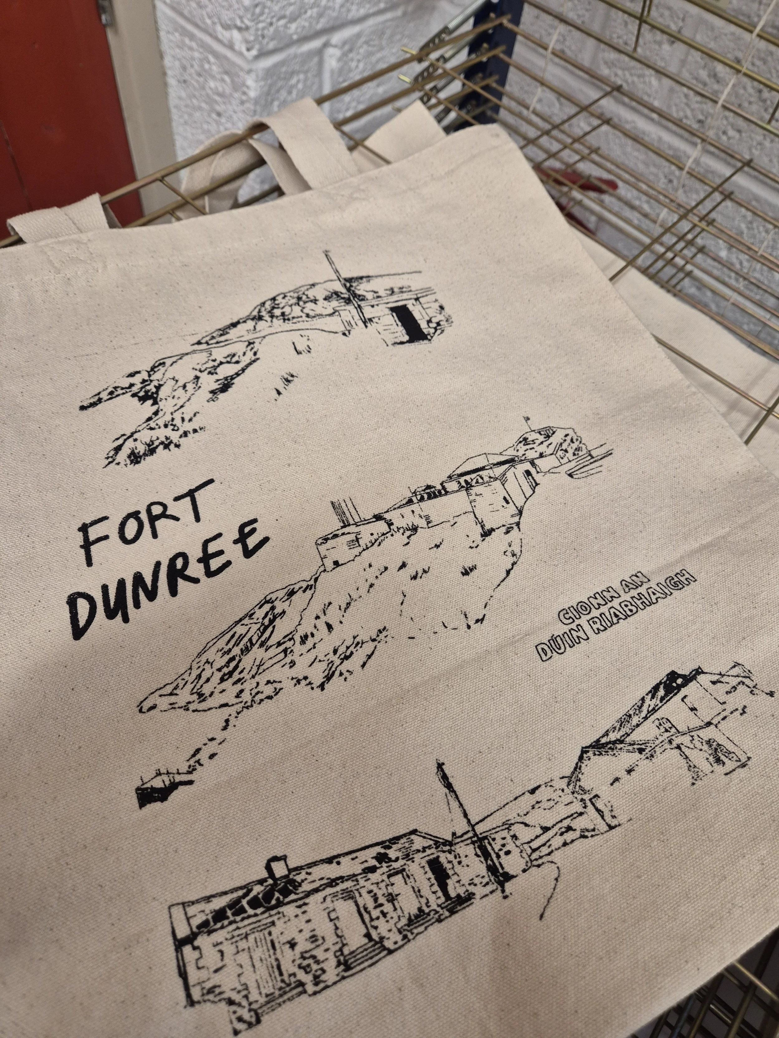 The SĂșilĂ Fort Dunree tote features 3 different hand drawn aspects of the site at Dunree along with the name in English and âDunree Headâ in Irish.